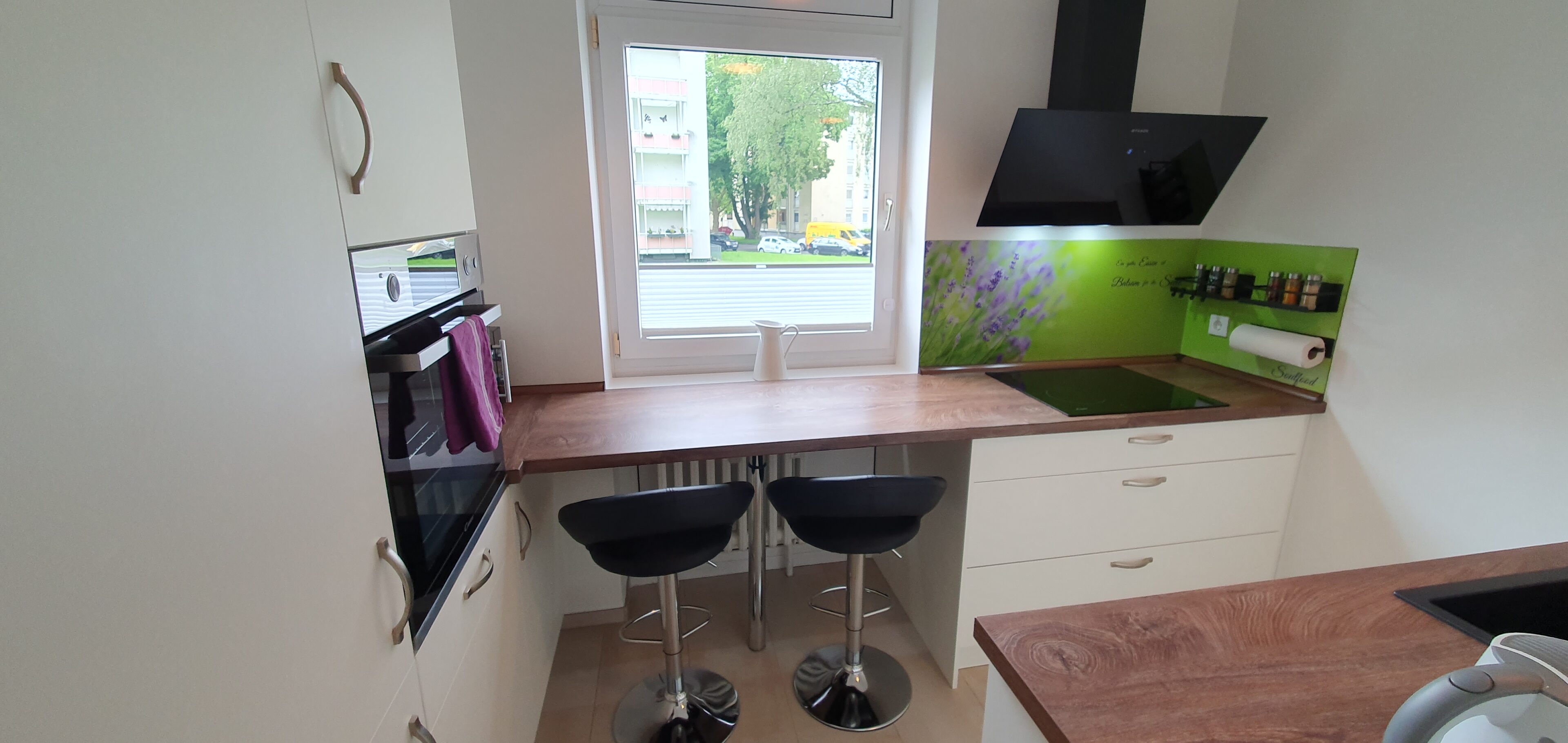 Die Einbauküche ist komplett ausgestattet und verfügt über einen Induktionsherd, Backofen, Mikrowelle, Kühl-/Gefrierkombi, Spülmaschine, Wasserkocher, French Press, Toaster, Töpfe, diverses Geschirr und Besteck usw. und bietet Hobbyköchen viele Möglichkeiten.