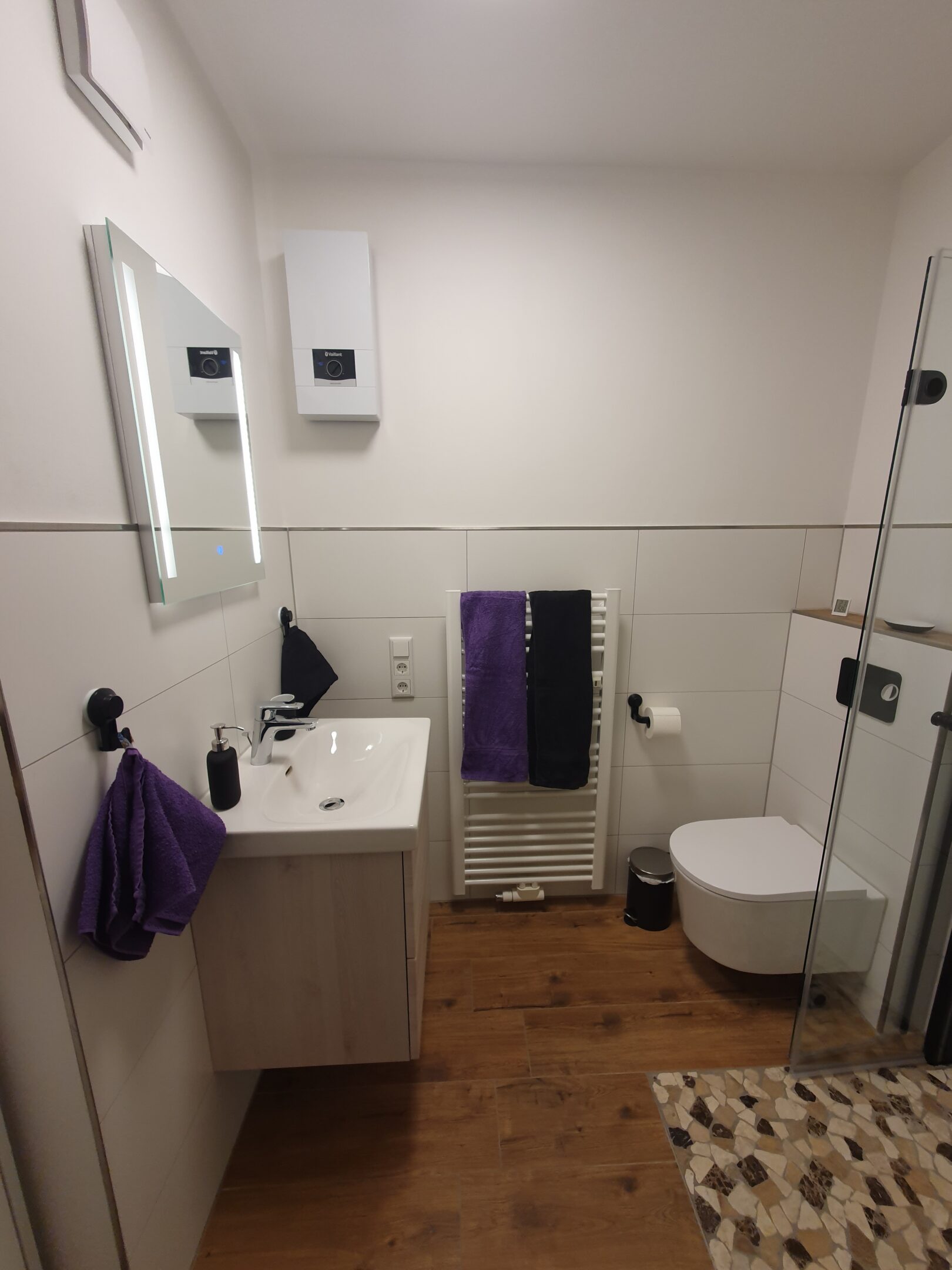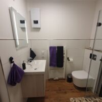 Die Wohnung wurde 2022/2023 liebevoll renoviert. Das hochwertige und gemütliche Bad verfügt über eine ebenerdige Regendusche, Fußbodentemperierung und eine tageslicht-helle Deckenlampe. Handtücher sind vorhanden.