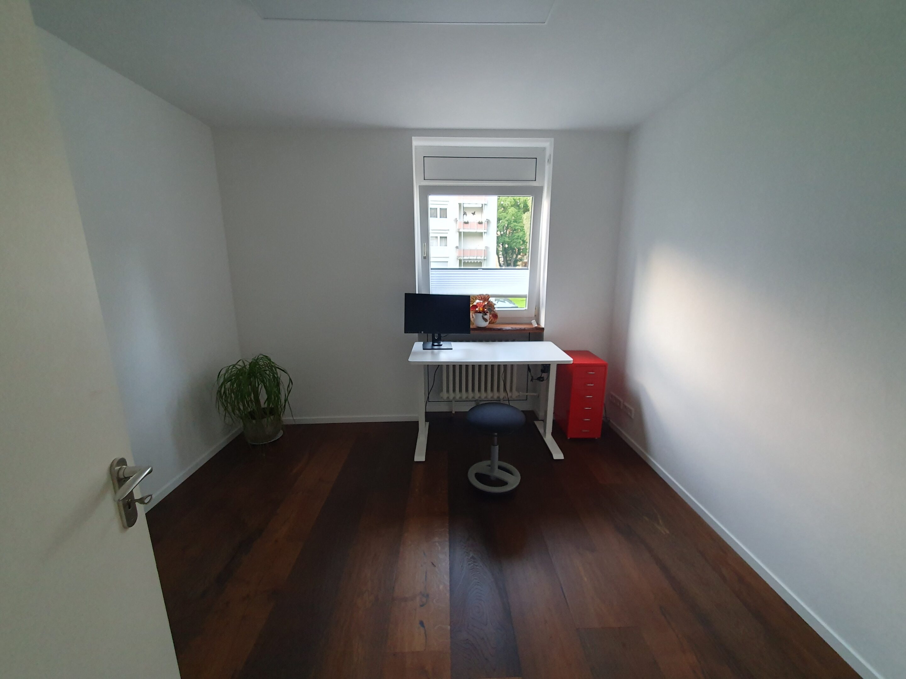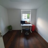 Das Büro wirkt durch das hochwertige, dunkle Parkett und die hellen Wände sehr elegant und ist mit einem elektrisch höhenverstellbaren Schreibtisch und ergonomischen Hocker ausgestattet.