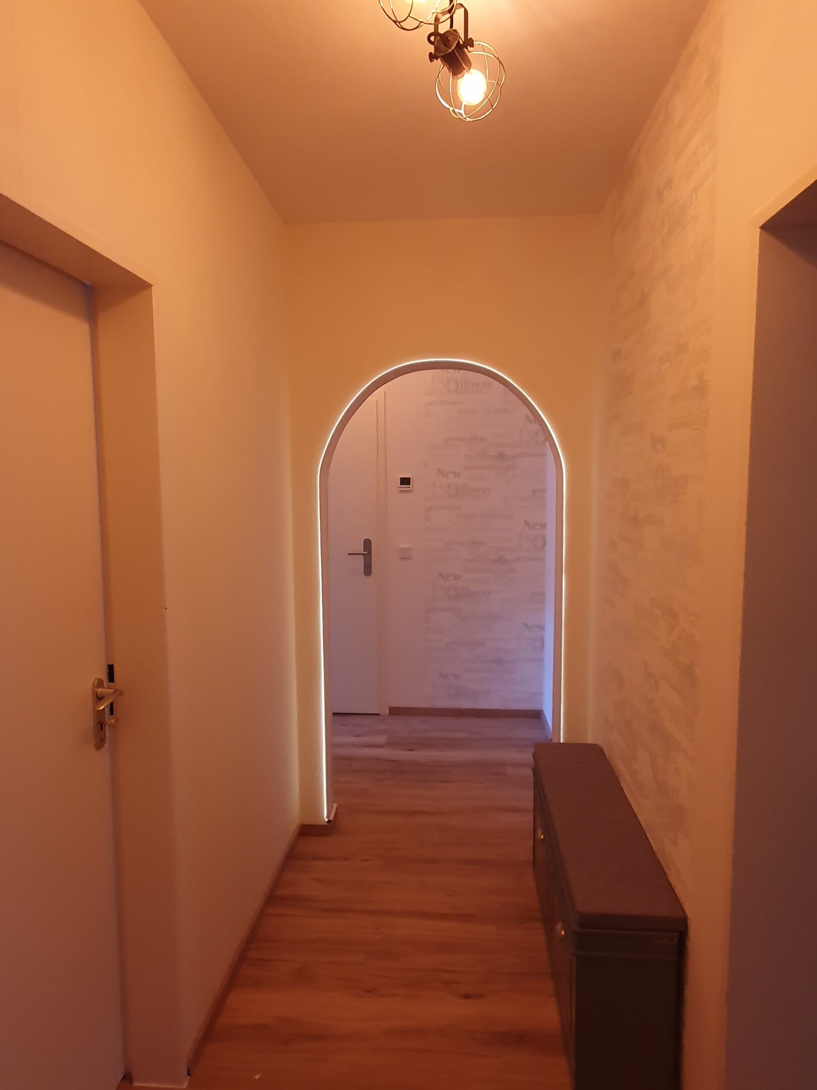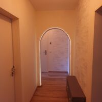 Der lange Flur mit Schuhschrank und Garderobe ermöglicht den Zugang zu allen Räumen der Wohnung.