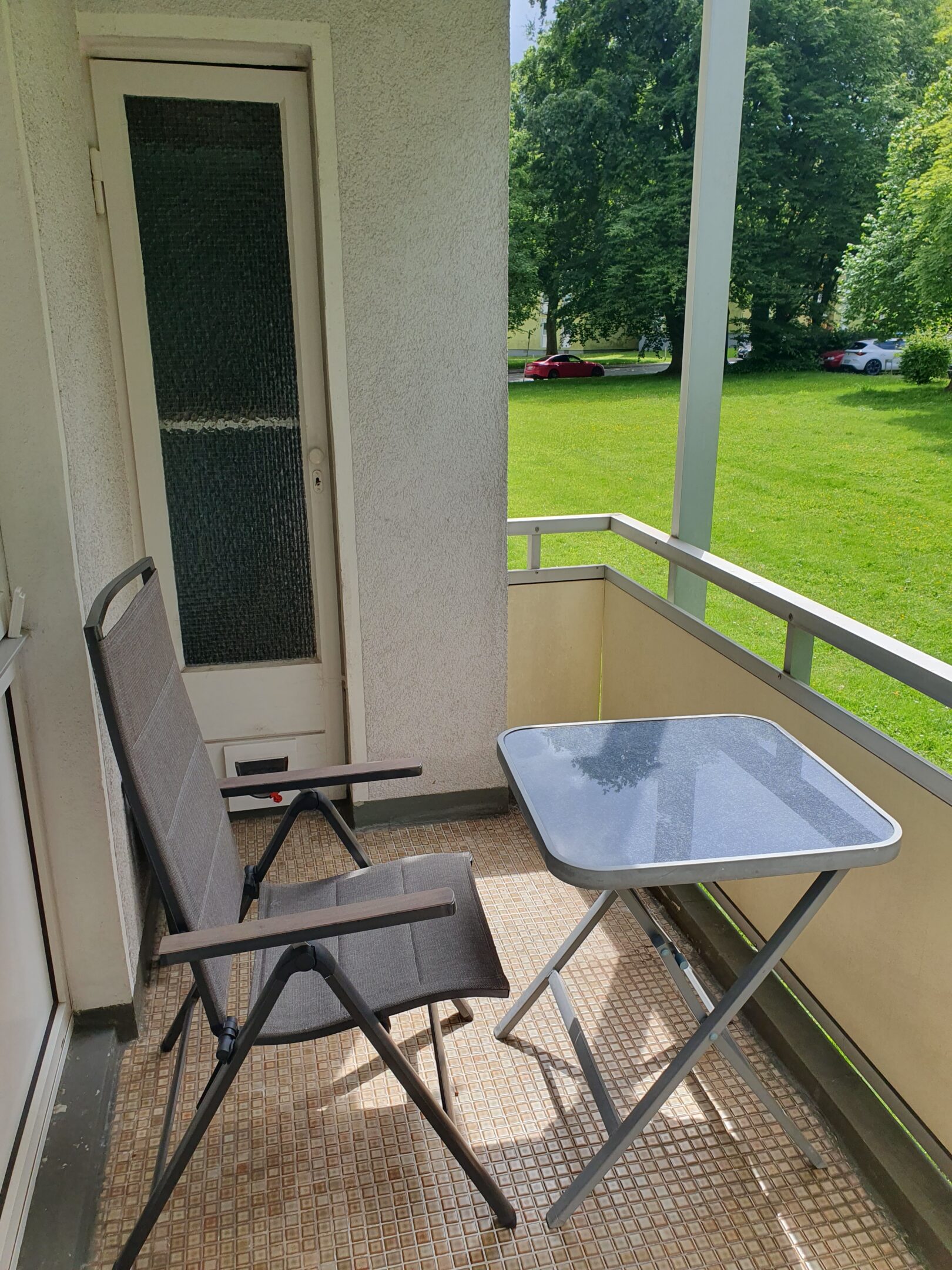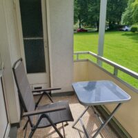 Die Wohnung besteht aus einer kleinen, voll ausgestatteten Küche, einem kleinen, innenliegenden Bad, einem Schlafzimmer, einem kleinen Büro und dem Wohnzimmer mit direktem Zugang zum Balkon. Balkon, Wohnzimmer und Schlafzimmer sind nach Süden ausgerichtet, Küche und Büro nach Norden. Dank der Lage im Edgeschoss und dem Baumbestand auf der Südseite bleibt die Wohnung selbst an warmen Sommertagen angenehm kühl.
